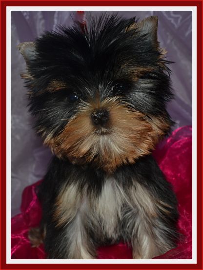 Elevage de chiens de race Yorkshire en Corse. Type bien particulier à mon élevage: petit nez très court, petites oreilles, corps bien carré, pas haut sur pattes. Tête de poupée. Taille standard ou miniature. Chiots inscrits au Lof, pucés, vaccinés issus d'excellentes origines, élevés en famille